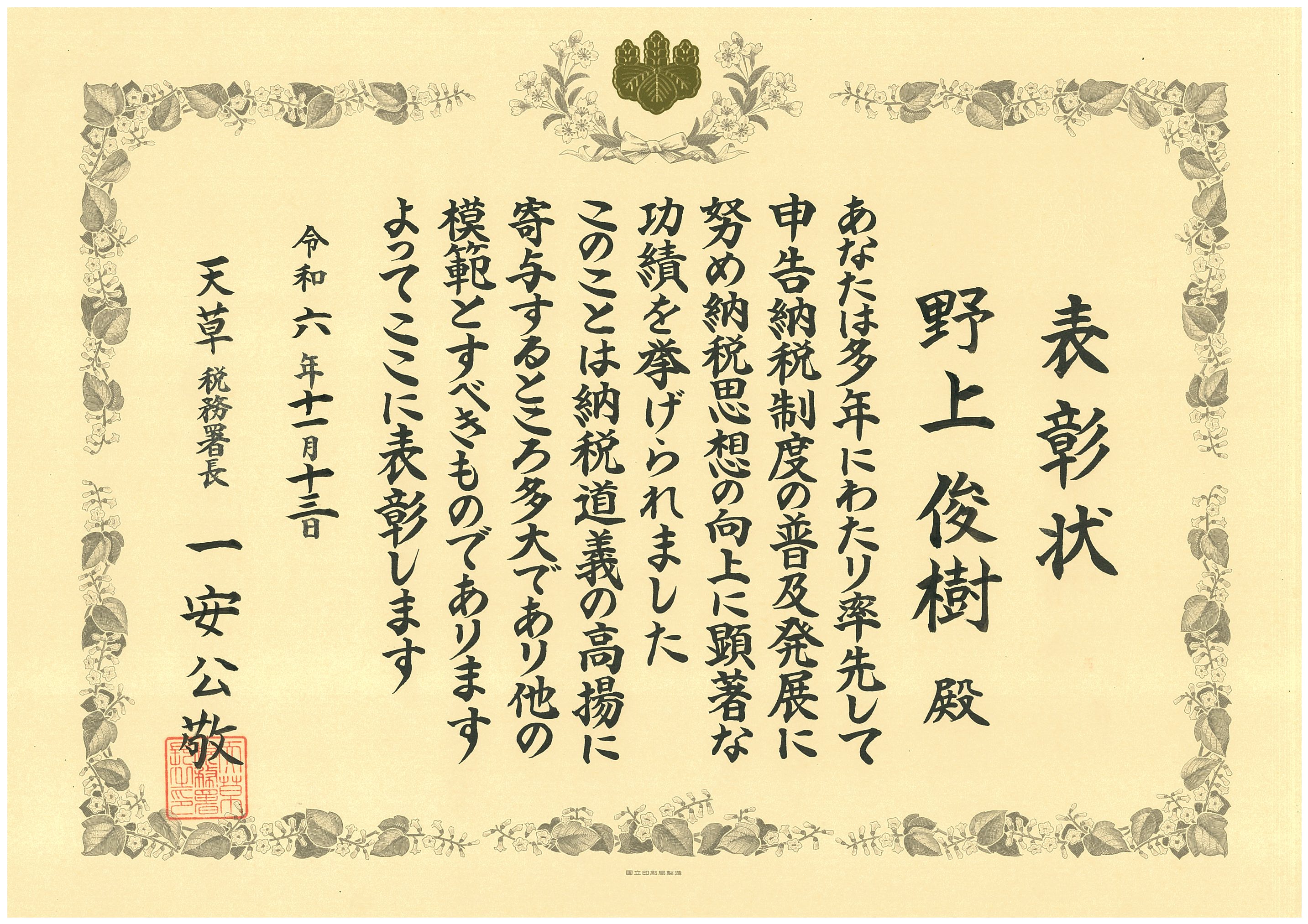 令和6年11月13日 天草税務署様より納税表彰を賜りました。今後とも健全経営のもと納税思想の普及発展に努めてまいります。